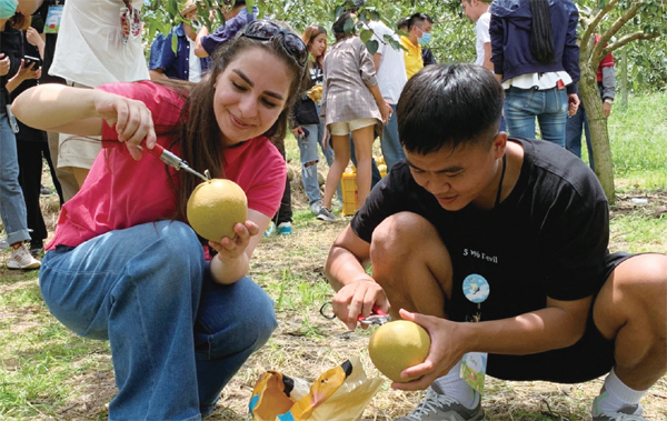 ▲今年7月份梨子成熟時,東勢區農會特別邀請這群國際學生到梨之鄉休閒農業區參加梨子豐收祭,圖為伊朗、緬甸學生。