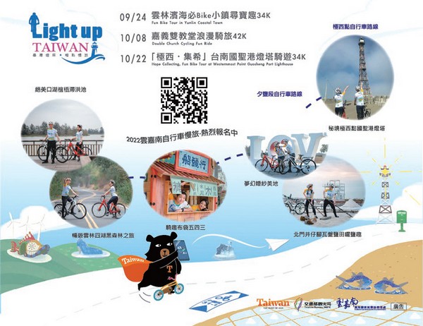 首場9/24的「雲林濱海必Bike小鎮尋 寶趣-34K」,從口湖遊客中心出發,以 「尋寶濱GO卡」集章方式騎遍雲林口湖、 四湖打卡勝地;10/8的「嘉義雙教堂浪 漫騎旅-42K」,以幸福氛圍完成1日雙教 堂(高跟鞋教堂及水晶教堂);壓軸登場 的10/22「台南極西.集希國聖港燈塔騎 遊-34K」活動,國聖港燈塔在交通部航 港局今(2022)年積極重建,呈現新舊交 融的獨特生命力,搭配「勇敢追夢-比基尼 辣妹自行車團」輪耀集希燈塔,象徵燈塔 旅遊正式啟動。