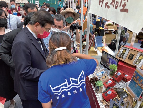 ▲交通部部長王國材巡視雲嘉南濱海觀光圈的攤位