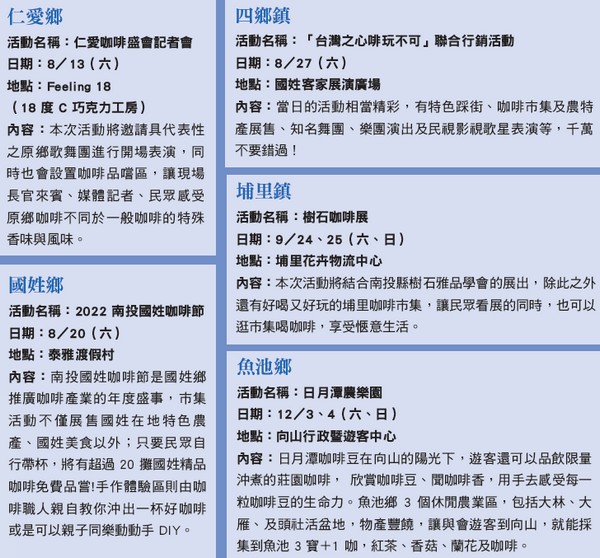 此外,「台灣之心 啡玩不可」四鄉鎮 聯合行銷活動於8/27在國姓客家展演廣 場盛大舉辦,埔里鎮「樹石咖啡展」則於 9/24、25 在埔里花卉物流中心舉行。最 後則是由魚池鄉「日月潭農樂園」作為最 後一棒,於12/3、4在向山行政暨遊客中 心舉行,可說是在中央、地方的共同努力 下,南投的咖啡活動將一路精彩到年底。
