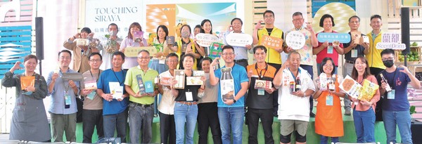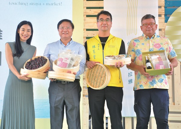 ▲(左起)仙氣女星大久保麻梨子、西拉雅風景區管理處處長徐振能、台南市西拉雅觀光產業協會理事長林憲堂、台中市旅行公會理事長馮國豐,共同開「香」市集好物。