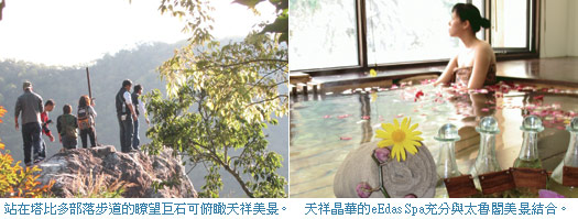 旅遊放大鏡:天祥晶華eEdas Spa有著濃濃的峇里島風格,休閒味十足;不過,最令人激賞的莫過於藉由飯店優越的地理位置,讓遊客在做Spa時,能將太魯閣最具特色的峽谷景觀盡收眼底。