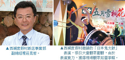 擁有多年品牌經營經驗的西湖度假村時時創新手法,從飯店的改建到景區內節目的推陳出新,時常令旅客感到耳目一新。西湖度假村飯店事業部副總經理莊昆哲表示,西湖度假村每天都安排不同的節目供旅客欣賞,今年邀請「日本鬼太鼓」演出,為西湖度假村增加不少觀光人潮,與去年桐花季到訪西湖度假村的6萬多人相比,預計今年將突破10萬人次。西湖度假村今年增加碳酸氫鈉泉的溫泉設施,碳酸氫鈉泉是由西湖度假村地表向下鑽探1600公尺後獲得的溫泉水,經過西湖度假村的重新規劃後,有溫泉、SPA的服務提供旅客使用。住房方面,西湖度假村正將原有的40間小木屋改建成20的villa,預計完成後,每個房間將有60~100坪的住房空間,提升住房品質。