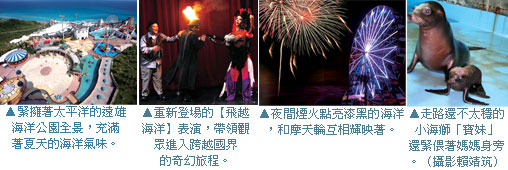 【海豚秀】、【晃晃海獅秀】、【美人魚生態教室】、還有魔幻大秀【飛越海洋】,都是超越國內國外精湛的表演。特別是頗受好評的【飛越海洋】,今年暑假新加入烏茲別克「傳統操偶」藝術團隊,再度重新登場,精采萬分。