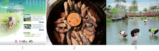 焢窯是許多四、五年級生熟悉的童年回憶,不過對一般都會人而言,可是稀奇新鮮的活動,新城鄉著名的特產~ 芋心地瓜,紫色的瓜肉芳香甜美,園主林聰明先生生動活潑的解說常逗得聽眾哈哈大笑,現採現烤的歡樂氣氛更讓玩過的人都說讚。在志學農場主人陳長宏的帶領下,原本只覺得美景如畫的田園,變成驚奇不斷的發現,各種您知道的、不知道的農作物,邊吃邊看樂趣無窮。立川漁場「摸蜊仔兼洗褲」的活動可不是隨便摸摸,這裡的環境之美遠超過你的想像。乾淨的水質、美麗的植栽、加上縱谷青山的陪伴,「摸蜊仔」不只是玩水找美食,而是一種無比開心的享受。色澤亮麗金黃的黃金蜆讓你有玩有吃滿載而歸。
