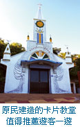 時,教堂原為木造,後來受颱風侵毀,重建時部落族人參考耶誕卡片,卡片上有一座美麗的歐洲哥德式小教堂相當美麗,相當受到族人喜愛,於是仿造卡片樣式建了一面白色天使、尖頂鐘塔、歐式拱門的牆面,但是就真的象一張卡片一樣,美麗的建築只有一面,完全模仿了卡片的精要之處。教堂處遠方傳來的海浪拍打聲,寬心閉目、豎耳聆聽,彷彿置身東海岸交響樂團中,樂聲澎湃激昂、餘音不絕於耳,同業不彷歸納此一景點