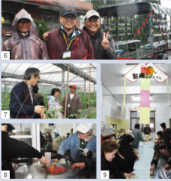 6.鐵牛車懷舊之旅。北市公會委員陳松桂(右)、宜蘭大學休閒資源及產業發展中心博士林亞立(中)。7.農民於果園互動導覽。8.DIY炒冰。9.瓜瓜樂風車DIY。