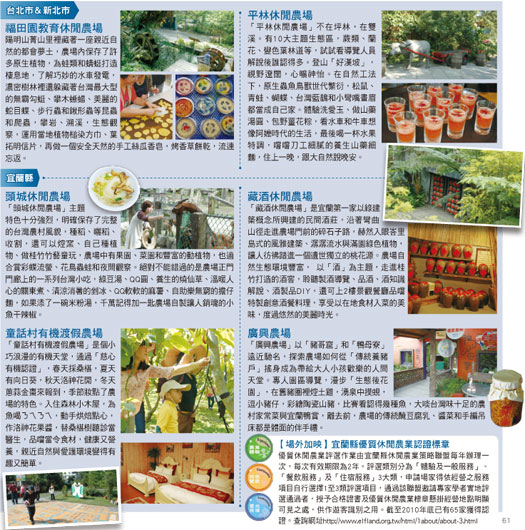 台灣休閒農業發展協會發展於5 13起連續4天參加TTE,頂著「服務品質認證標章」光環,攤位上人氣旺盛,從農場「美食體驗一日遊」、「精緻住宿二日遊」、「慢活漫遊四日遊」到訴求「健康.旅療」的身心靈遊程,創意又活潑的整合全台百家休閒農場與民宿,推出各式產品與推薦行程,還大玩「滿額禮大放送」、「加購禮回饋送」,為台灣本土的休閒農業觀光寫下佳績。2010年已陸續有22家休閒農場獲得認證,農委會今年將再補助前30家申請的農場,免繳所有費用。第一梯次報名時間為 5/2~31,第二梯次7/4~29報名,認證效期2年,業者請把握良機。詳情查詢官網 http://www.taiwanfarm.org.tw/sqc。