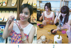 1.《食尚玩家》主持人莎莎參與宜蘭踩線一日遊, 於白米木屐村D I Y木屐。(圖片提供>文建會)2.《食尚玩家》主持人莎莎於橘之鄉蜜餞形象館DIY蜜李。(圖片提供>文建會)