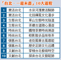 觀傳局表示,配合9/ 3 0 登場的 2011台北世界設計大展,10大遊程當中特別推薦「文創台北」路線。精心規劃的10大遊程,還有同場推薦周邊特色景點、美食、伴手禮、奇趣體驗、特色旅店等介紹。活動資訊詳情請上活動官網查詢:exploretp.lohasfun.org.tw。