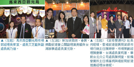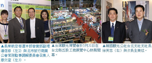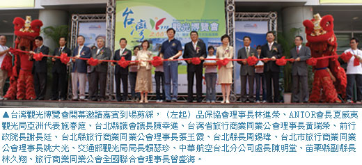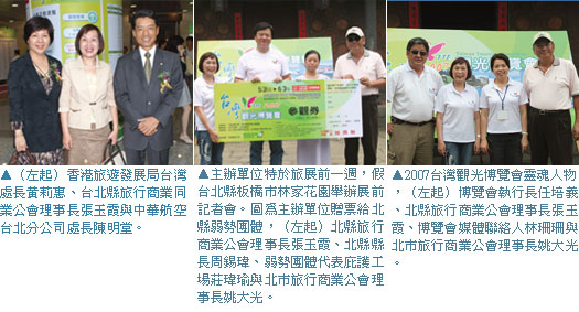 第一個由旅遊業界自行主導、策辦的旅遊展—2007台灣觀光博覽會於6月3日圓滿結束, 5月31日開幕當天邀請到前行政院長謝長廷、交通部觀光局長賴瑟珍、台北縣長周錫瑋與多位航旅業界、外國駐台辦事處代表當場。賴瑟珍表示去年台灣觀光人數是352萬人,成長率4%,今年將成長目標訂7%,未來將以「打造老景點的活力」重現台灣之美。而周錫瑋計畫將選在「淡水、八里」和「三峽、鶯歌」、「烏來、平溪、雙溪」推動觀光旗艦計畫。