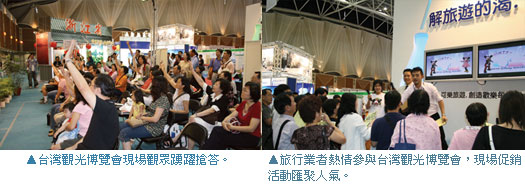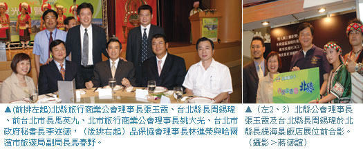 台灣觀光博覽會在5月31日熱鬧開場,台北縣長周錫瑋為了盡地主之誼,特別在台北縣政府的6樓宴請所有台灣觀光博覽會參展廠商,並邀請到前台北市長馬英九、北市公會理事長姚大光、北縣公會理事長張玉霞、品保協會理事長林進榮到場致詞。馬英九表示台灣每年352萬的觀光客來台觀光,其中,只有151萬人是單純來台觀光,而日本客占了110萬,其餘才是世界各地的人士,顯見日本市場來台觀光已經相當飽和,應該朝向其他地方發展台灣觀光,然而大陸的開放觀光就是一條很好的路,不僅有利台灣觀光發展,連帶交通運輸產業、旅館業、遊樂園區,都將更蓬勃發展,台灣經濟將會更有競爭力。周錫瑋也補充,台北縣是台灣最大的縣市,人口有377萬人,對於發展台灣觀光,台北縣更不能落人後,因此在台北縣議長陳幸進的支持下,台北縣未來將以高科技及觀光產業為主,其中,又以觀光產業的發展更為重要。