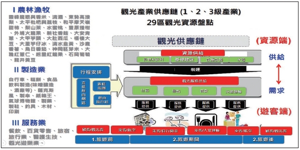 盤點台中市29個行政區觀光資源,台中市觀光旅遊局將各區資源歸納成1、2、3級產業,分別為第1級產業的農林漁牧,第2級的製造業,第3級的服務業,透過資源整合,結合觀光休閒和行程安排,從資源端的供給,到