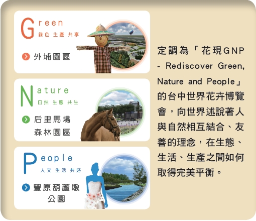 定調為「花現GNP-RediscoverGreen,NatureandPeople」的台中花博,目的向世界述說著人與自然相互結合、友善的理念,在生態、生活、生產之間如何取得完美平衡。在這個宗旨下,台中市觀光旅遊局局長陳盛山不斷找尋在GNP元素上志同道合的花博合作企業夥伴,並將合作單位的類別從中台灣擴及到來自全台的各個國際知名品牌,透過國際通路的加乘效果,將花博形象宣傳出去。