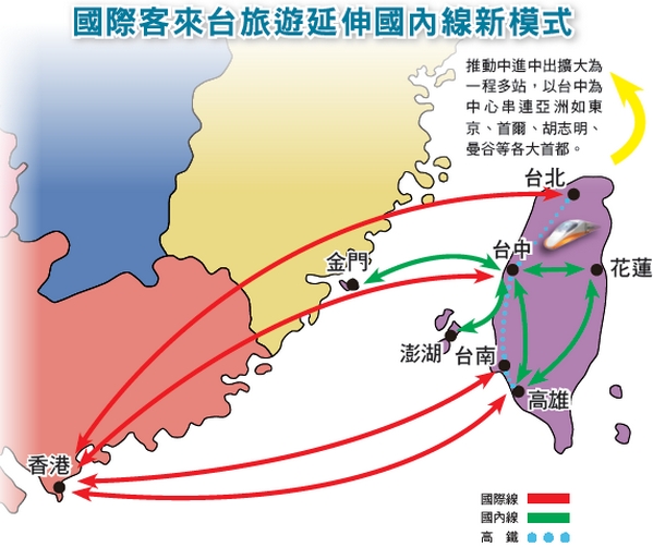 陳盛山指出,隨著香港記者會的舉辦,象徵著以台中作為旅運樞紐的「一程多站」國際國內聯票旅遊模式正式啟動,未來港澳地區民眾可以選擇「中進中出」、「南進中出」、「中進南出」方式,自由規劃離島、台中、花蓮、高雄等主題式旅遊組合,豐富多元的遊程選項,花博期間預期再創港澳赴台旅遊熱潮。