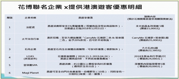 會場上為了展現聯名行銷成果,特地打造一個品牌陳列區,不僅傳遞台灣的精美工藝與花博的魅力形象,也具體呈現「2018台中世界花卉博覽會」與國際企業合作的多樣性。值得一提的是,2018台中花博舉辦期間,觀旅局更將擴大與國內外業者合作,推出「聯票結合花博門票」的第2波優惠與抽獎方案,攜手旅遊業者們一同炒熱市場熱度。