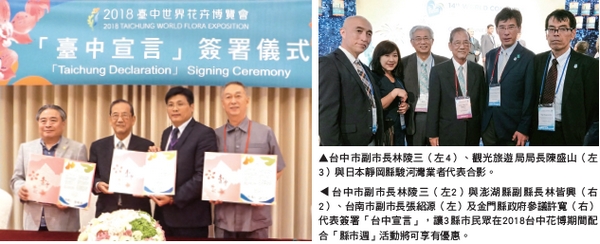 值得一提的是,目前共計台南市、澎湖縣、金門縣、台北市、新北市、宜蘭縣、基隆市、桃園縣、新竹市、苗栗縣、南投縣、彰化縣12縣市都加入「台中宣言」的簽署行列,各縣市花博縣市週也將公布在台中花博官網。