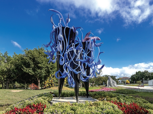 ▲后里森林園區的大型裝置藝術《聆聽花開的聲音》,上頭700朵小花裝有機械馬達控制,能夠配合聲光效果自由開合,變成一朵最有生命力的機械花。