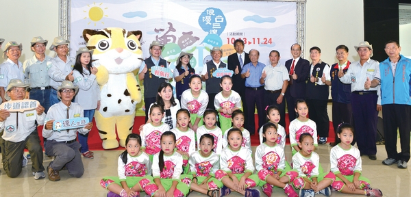 ▲「浪漫台三線—苗栗漫遊古步道」記者會,由苗栗縣縣長徐耀昌(後排左8)、苗栗縣文化觀光局局長林彥甫(後排左6)、台灣旅行業國民旅遊發展協會理事長朱永達(後排左9)共同參與。