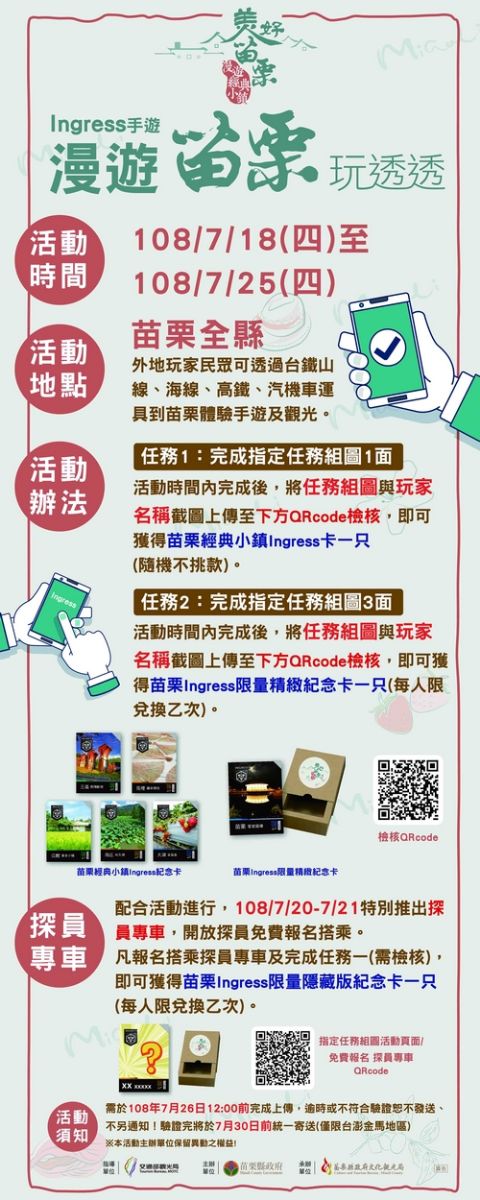 看準手遊的風潮,苗栗縣政府特別針對漫遊苗栗特色小鎮系列活動推出移動觀光遊程,結合知名手機遊戲「Ingress」,廣邀全台民眾可透過台鐵山海線、高鐵、汽機車運具到苗栗體驗手遊及觀光,活動期間7/18~25內,凡至苗栗全縣完成1面指定任務組圖,即可將任務組圖與玩家名稱截圖上傳至指定網址,(https://forms.gle/qcsNDRsph8pWk46EA),可獲得苗栗經典小鎮Ingress卡一只(隨機不挑款)。