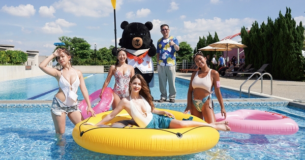 ▲參山國家風景區管理處處長柯建興及喔熊與安妮和泳池辣妹一同炒熱現場氣氛。