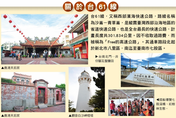 公路總局說明,北起新北市八里,南至臺南市曾文溪的台61線,縱貫臺灣西部海岸線,是條名符其實的「吹海風的路」,沿途包括各類風土民情及自然景觀,非常適合1日遊或2日遊,由臺北出發,行經白沙岬燈塔、永安漁港及綠色隧道、好望角、白沙屯拱天宮、大甲鎮瀾宮、高美濕地、鹿港老街、北門遊客中心、井仔腳鹽田等知名景點外,還能盡覽台61線永安脊背橋、鳳鼻隧道、大安大甲脊背橋、王功脊背橋、為保育鳥類而設置隔音牆的七股溪橋等特色工程建設,而且沿線還有許多秘境值得前去探索體驗。(可參閱公路總局出版的《吹海風的路》及《台61海路漫行》)