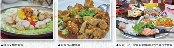 另外還有蒜蓉爆蝦、鮮蔬銀杏燴海蔘、筍香百菇匯排骨、鴨肉米糕、生魚片海鮮拼盤、絲瓜文蛤扇貝湯等料理,無論是清蒸、快炒、乾煎、糖醋,多樣料理,道道新鮮好吃,開胃又下飯,下次不妨來彰化縣王功村大快朵頤,體驗小漁村的美食魅力吧!