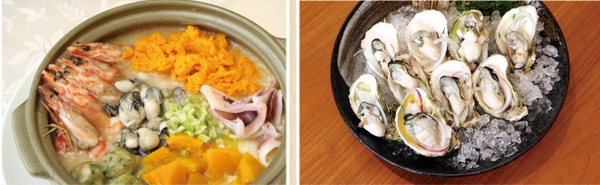 ▲澎湖明蝦海鮮粥、蒸鮮活牡蠣。