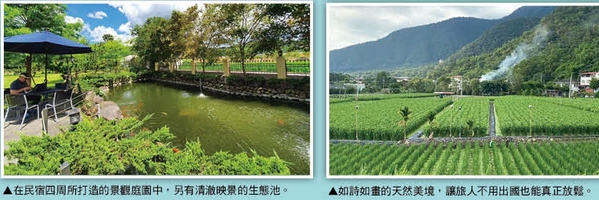 民宿佔地寬敞、視野開闊,在民宿四周所打造的景觀庭園中,保留足夠的綠地,另有清澈映景的生態池,當然您也可以選擇騎著單車,自在悠遊田野間,享受徐徐微風,感受反璞歸真的愜意。