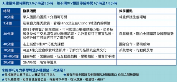 妮娜巧克力夢想城堡1樓展示精彩的3D投影光雕秀、巧克力主題禮品區;2樓規劃巧克力DIY教室、歐式地窖餐廳提供可可風味餐、義式冰淇淋及咖啡;3樓除了台灣首創薄片夾心巧克力的透明產線,還有巧克力互動遊戲機、可可知識區,讓大小朋友在輕鬆歡樂下吸收巧克力相關知識。歡迎旅遊同業多加合作,請洽業務部莊若言小姐049-2919528*725