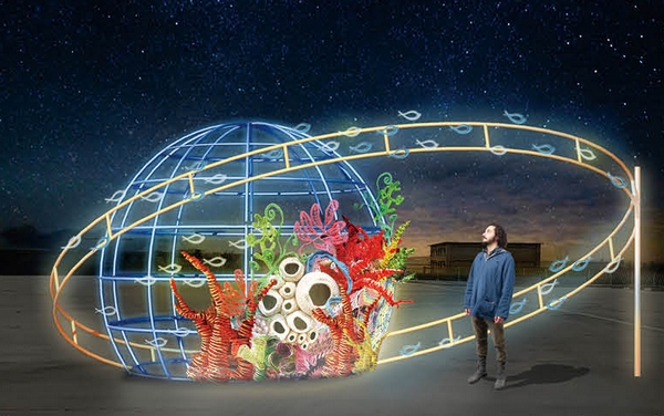 大型鉤織創作的藝術家—楊海茜老師與藝達科技合作創造大型鉤織藝術的新可能,以溫暖手感的鉤織特色營造珊瑚礁的溫柔,並與複合材質結合,展現魚群優游珊瑚礁的畫面。穿梭片面的珊瑚礁場景亦有保育海洋的意涵,喚起對環境保育的意識,希望共同守護美麗的澎湖海域。