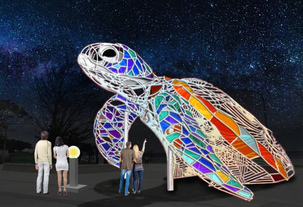 乞龜、乞綵、乞平安,淳樸的澎湖傳承著百年來世代間的情感與集體記憶。設計來自藝術家—張建祥,擅長以多變的手法與大型燈光作品展現當地核心特色,此次以在地傳統慶典文化為核心,用現代的形式體現這座海島文化的特殊性。龜紋以浪為刻畫,寓意為每一位在海上拼搏的討海人都能乘著浪平安歸來;繽紛色彩的堆疊與叢聚代表海洋資源的豐富性,祈求這片島嶼與海洋能永續共存共榮,並希望透過水晶球祈願讓眾人的願望都能心想事成。創作者張建祥先生帶領著多位藝術同好共同創作本次龜來運轉作品,他最擅長金屬材質的運用,看似剛硬的金屬鐵件,透過藝術家的巧手,展現優雅的姿態,張建祥先生最擅長動物造型,這次挑戰澎湖海龜希望能讓前來參觀的民眾感受不同凡響的視覺體驗。