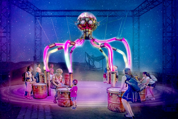 此次澎湖國際海灣燈光節也邀請到國外藝術家前來參展,來自澳州的Amigo&Amigo藝術團隊所設計的「搖滾章魚」外型相當酷似澎湖的石鮔章魚,除了獨特搶眼的造型外,章魚的八隻觸手則是會隨著民眾打擊放置在周圍的鼓而律動,讓每個打擊者都可以是燈光展演的規劃師。「搖滾章魚」來到海島樂園,邀請大家一起打擊合奏,跟著打擊節奏律動,體驗歡樂動感的樂趣,結合五彩繽紛的燈光讓觀眾彷彿不再是觀眾,而是成為了Octopoda表演的一部分。