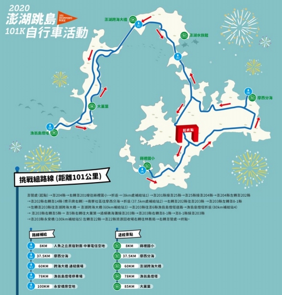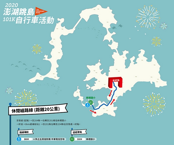為配合觀光局推動「2020台灣自行車節」,促進澎湖觀光運動發展,由交通部觀光局澎湖國家風景區管理處辦理「2020澎湖跳島101K自行車活動(101 Hopping Bike)」,結合地質、海景與優美自行車道,9╱20號召全台車友一起以20公里的時速來「BIKE」訪世界最美麗海灣!