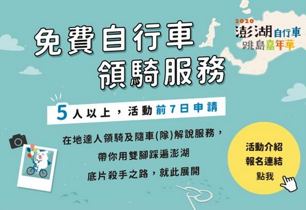 此外,澎管處今年也特地延長自行車領騎活動的報名期限到9╱30止(或限額500名為止),車友們只需5人以上團體於7天前透過網路報名預約申請,澎管處行銷粉絲團更提供住宿券、限量紀念車衣、喔熊聯名商品等不定期抽獎活動,歡迎全國車友共襄盛舉,跨海澎湖體驗自行車逍遙遊,探索祕境,享受菊島旖旎風光。