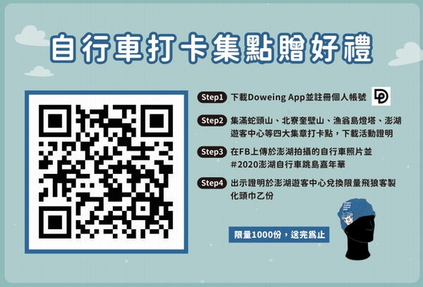 澎管處今年與Doweing(叨位)、JackWolfskin(飛狼)跨品牌聯名合作,即日起下載Doweing app集滿#蛇頭山#北寮奎壁山#漁翁島燈塔#澎湖遊客中心4大集章打卡點,即可參加活動。憑活動證明FB上傳澎湖自行車美照,且#2020澎湖自行車跳島嘉年華,就可以於澎湖遊客中心兌換JackWolfskin(飛狼)限量自行車頭巾ㄧ個(限量1,000名)。