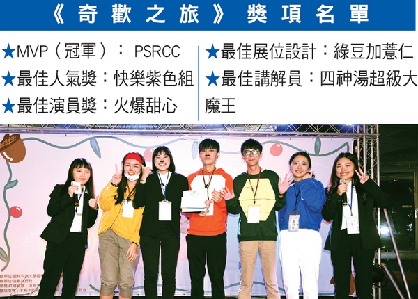 同學們精彩絕倫的表演貫穿整場成果展,獲得了在場觀眾熱情滿滿的回應,而在全體同學的出色表現後,評審選出當天最有價值之團隊,最後由PSRCC-IG潮遊金門獲得冠軍,贏得由逸歡旅遊提供的「北海岸溫泉2日遊」,在頒獎歡呼聲之中,第11屆管理學成果展—「奇歡之旅」圓滿落幕!