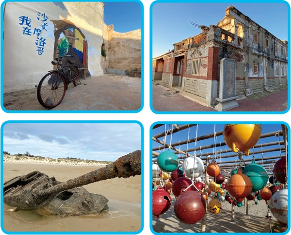 先到訪金門的產品(先到訪澎湖產品則反過來走訪),遊程規劃陳景蘭洋樓、慈湖三角堡、後浦小鎮、山后民俗村、獅山砲陣地、峰上巡檢司城,沙美老街、陽翟老街、太湖3D斑馬線、南石滬公園、翟山坑道等多樣景點,其中還有最熱門的旅遊勝地—沙美摩洛哥,曾經是金門最熱鬧的街道之一,很多地方都是停留在2、30年前的風貌,也因此有了小摩洛哥的稱號,是不可錯過的偽出國景點。