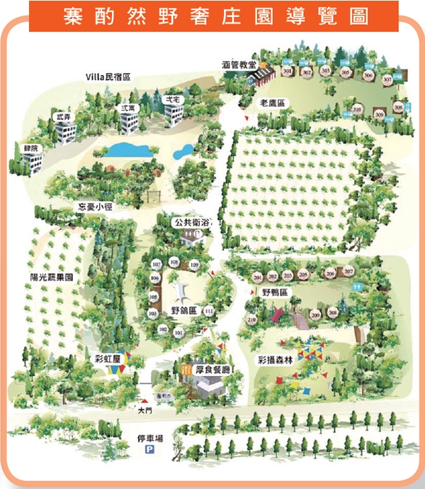 區內植滿綠色草皮,種植羅漢松、流蘇、山櫻花隨季節更換不同的妝彩。冬季落羽松轉紅,當風吹過飄落紅雨如詩如畫,讓旅客放鬆舒壓或跑或跳縱情自然。園區占地約5公頃,擁有老鷹區、野鴨區、野鴿區露營地,以及正在興建中的Villa民宿區,還有涵管教堂、彩虹屋、彩攝森林、厚食餐廳、陽光蔬果園、忘憂小徑,提供1泊2食兼活動的方式進行,活動依季節做調整,讓住客每次來都能體驗不同的活動課程,入夜後升起熊熊營火,大地餐桌上演美食饗宴,主廚精心烹調餐點、自然為景、蟲嗚為樂。睡覺前還能享受星空電影院,讓自己投身在大地之中,享受最自然的反璞歸真。