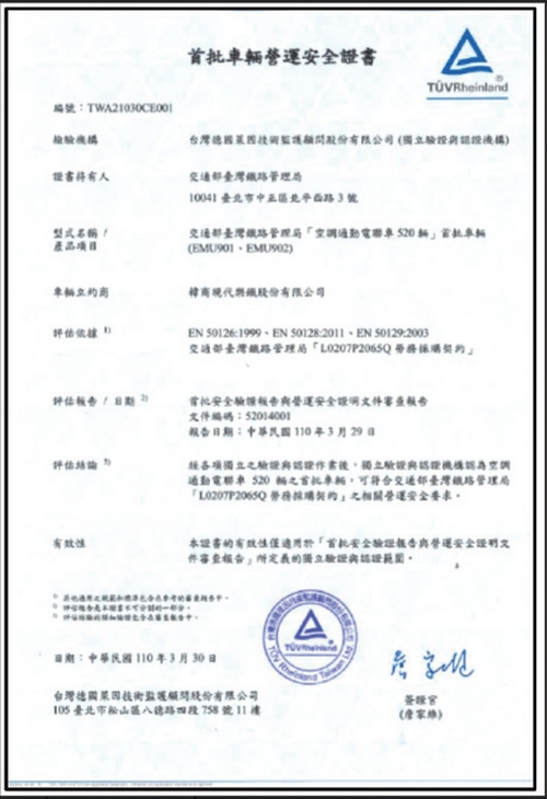 臺鐵局新一代通勤電聯車EMU900型歷經長達半年以上的測試、調校以及嚴謹的試運轉測試後,已於3╱29正式取得第三方獨立驗證與認證公司(IV&V)—TÜV德國萊茵技術顧問,所核發之安全營運證明,證明EMU900型電聯車相關性能均已符合契約規定之安全營運要求。