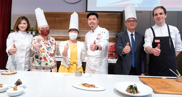 ▲(左起)世界藝術烘焙廚藝金牌的老師裴志偉、美食評論家胡天蘭、台中市府觀光旅遊局局長韓育琪、台中福華大飯店華裔星級主廚William Shen、台中市觀光旅館公會理事長廖國宏、奧地利籍米其林主廚Klemens Schraml。