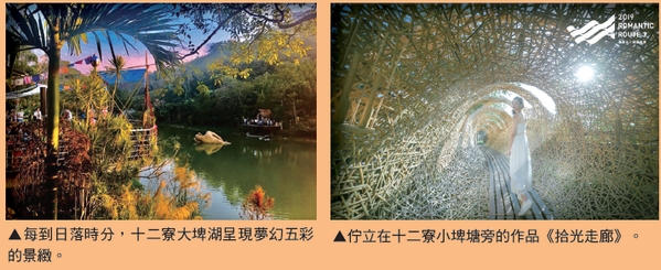 十二寮「時光村」配合浪漫台三線藝術季的「慢漫生活節」,在十二寮所展出的地景藝術作品,作品由6位印尼藝術家以回收材料、廢棄物、竹子等材料製作,包括進入台三線通往十二寮入口竹49線的《換日線》;佇立在十二寮小埤塘旁的作品《拾光走廊》、充滿客家文化的作品《輔娘持光》、由廢棄各種材料,木片、樹枝、瓷磚、瓶蓋,及塗鴉拼湊而成的古老鐘塔《慢鐘》,讓民眾能置身「隧道」般的藝術品《流逝的時光》,以及躺在十二寮大埤湖上的沉睡巨人,營造出十二寮特有的景致。