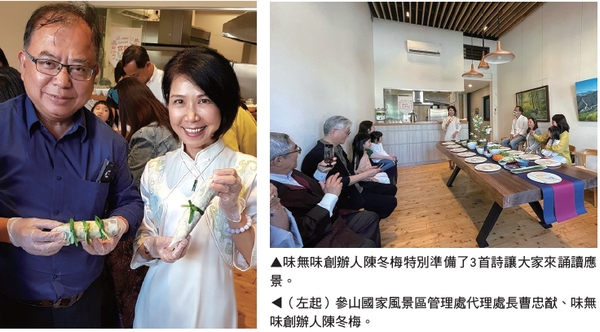 味無味的午茶沙龍以春盤為主題,為了配合主題的意境,陳冬梅準備了3首詩讓大家來誦讀應景,從唐朝杜甫「春日春盤細生菜,忽憶兩京梅發時。」、中彰區域觀光聯盟所推出的「食旅中彰.午茶生活節」,不單單只是一個串聯兩個縣市午茶的活動,其目的,更是深掘出台中、彰化兩個城市的魅力與亮點呈現,透過餐飲、生活模式、娛樂節慶的串聯,開啟中彰更多元璀璨的面貌。白居易「歲盞後推藍尾酒,春盤先勸膠牙餳」,到宋代蘇軾「蓼茸蒿筍試春盤,人間有味是清歡」,句句都讓人神往。其中參山國家風景區管理處代理處長曹忠猷特別以閩南語誦讀,而中彰區域觀光聯盟總召集人柴俊林則是用吟唱的方式表現,同樣令人感到驚艷。