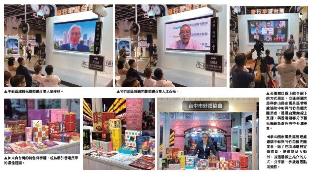 為了讓香港民眾更了解台灣的特色, 此次台灣館特別邀請到交通部積極推廣 的觀光圈業者透過視訊介紹台灣風光, 而旅展登場的首日,便邀請中彰區域觀 光聯盟總召集人柴俊林與竹竹苗區域觀光聯盟總召集人江百松透過視訊與現場的香港遊客與旅行業互動,推介觀光圈食宿遊購最新遊程,為台灣拚觀光商機。