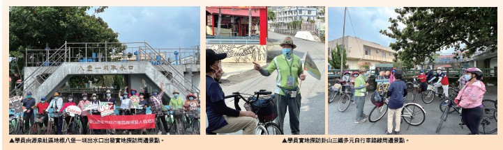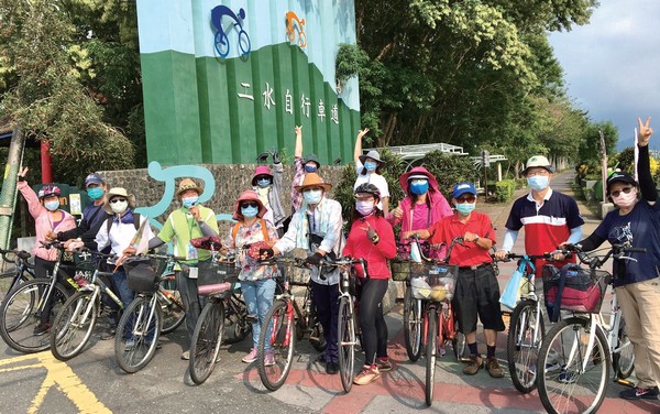 ▲二水在地領騎達人劉炳賀阿公與學員在二水自行車道地標合影。
