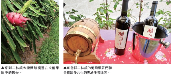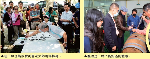 在這裡,旅客能體驗到酒莊品酒、在地文化生態導覽、果園採果、特色手做小物DIY,以及葡萄酒香飄揚─花燈海饗宴。以酒莊巡禮為例,國外盛行的「帶著高腳杯去旅行」場景就在二林能體現,旅客能在酒莊品酒室中透過酒莊主人的親自解說下,盡興的品嘗各類美酒。