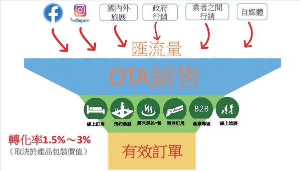 泰安觀止董事長江德利表示,無論是社群媒體、 國內外旅展、政府行銷、同業之間、自媒體的行銷活 動,都在一年內不同時間,陸陸續續重複發生,但對 於消費者的印象是很分散的,未來如果有旅遊計畫 不一定找得到,無法有效地轉成訂單。因此,旅圖 數位行銷系統(以下簡稱旅圖OTA),推出「整合生 態營銷」方案,將所有的行銷導流到旅圖OTA,旅客 可以安排訂房外,也能購買食、遊、購、行等周邊 延伸服務,有效轉換訂房量與附加旅遊商品量化。