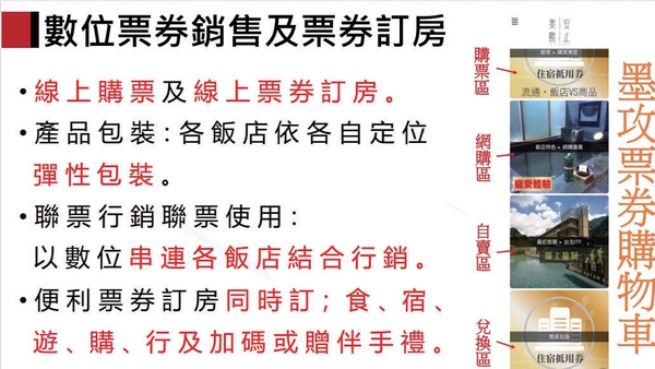 「策略聯盟」可以吸引消費者的關注之外,也能 自訂價格與包裝策略,維持最大的利潤與競爭力, 不再單打獨鬥,形成最強的銷售戰隊,成為彼此的 後盾。此外,消費者購買的聯盟內的「優惠聯票」 將在聯盟流通,無論是兌換哪一家飯店的房間或是 商品,都將錢留在聯盟之中,增進彼此的利益。江 德利強調,「優惠聯票」可以享受超值價格,以及 極大化的商品價值,讓旅客可以買6千享受1萬的 價值,飯店業者更能自主加碼,加贈金額給予消費 者,兌換餐食或是交通接駁,讓票券活化具彈性, 更是傳統人工銷售無法跨越的銷售利器。