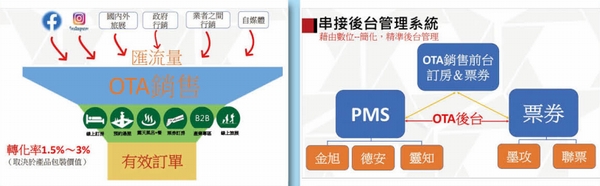 江德利表示,無論是社群媒體、國內外旅展、政府行銷、同業之間、自媒體的行銷活動,都在一年內不同時間,陸陸續續重複發生,但對於消費者的印象是很分散的,未來如果有旅遊計畫不一定找得到,無法有效地轉成訂單。因此,旅圖OTA推出「整合生態營銷」方案,將所有的行銷導流到旅圖OTA,旅客可以安排訂房外,也能購買食、遊、購、行等周邊延伸服務,有效轉換訂房量與附加旅遊商品量化。