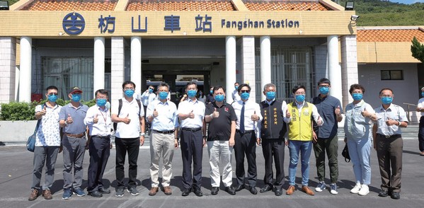 ▲枋山鄉鄉長洪啟能(左9)、枋寮鄉鄉長陳亞麟(左10)、臺鐵局附業營運中心總經理陳文川(左3)與貴賓於枋山車站合影。